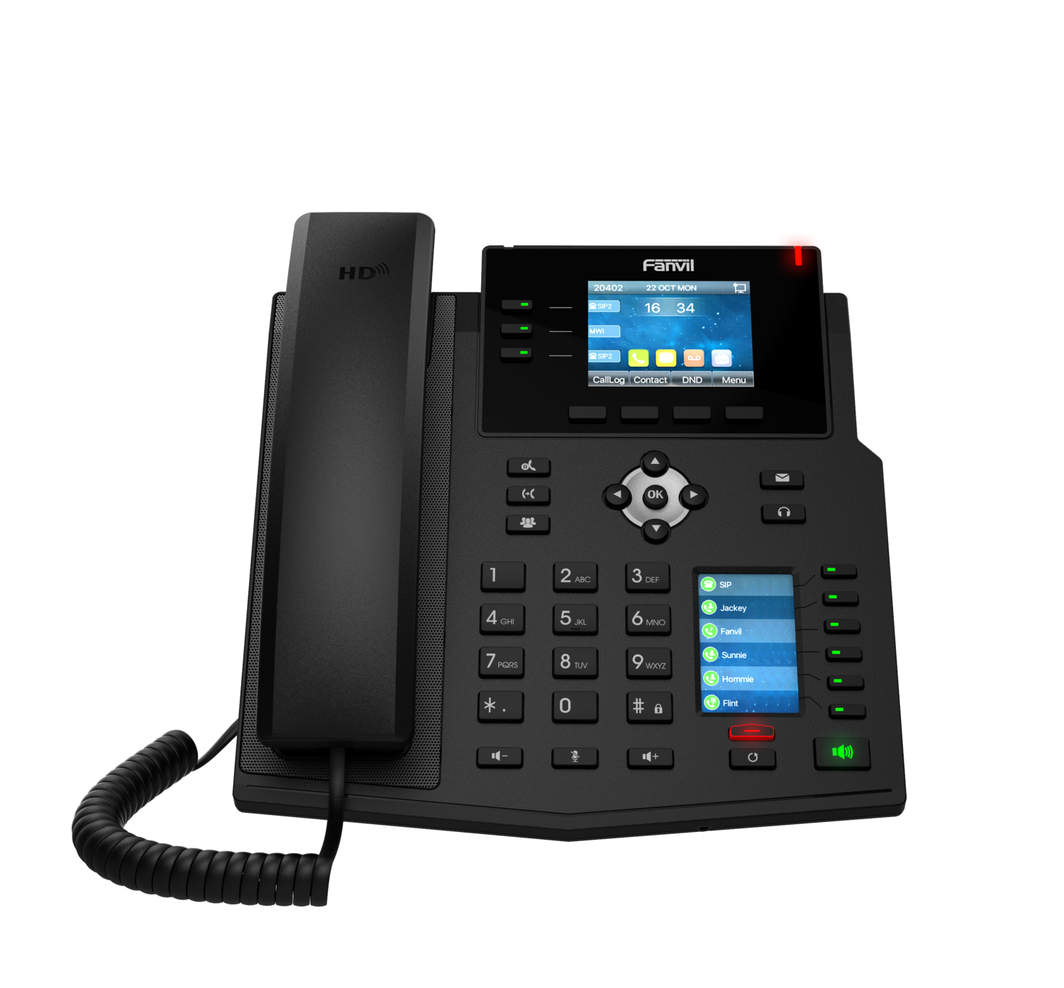 Telefono IP de 12 Lineas sip, con Doble pantalla color (1 dispaly color de 2,8? + Pantalla 2,4? para teclado DSS) , HD Voz, POE, LDAP, XML,VLAN, 2 puertos de Red Gigabit 10/100/100 Mbps, 3 Teclas en el display + 6 Teclas BLF X 5 äg. 30 botones Dss ,directorio,salida RJ9 head set, Bluethoot Con Dongle o WiFi Con Dongle ,Soporte de Pared (Opcional), Sin Fuente